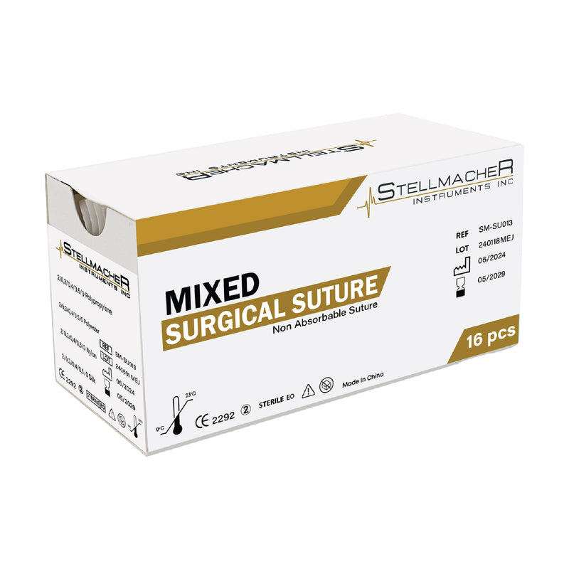 Upgrade your surgical supplies with the Mixed Surgical Suture Kit – 16 Pcs, specially designed for healthcare professionals. This versatile set contains non-absorbable sutures in various materials, USP sizes, and needle configurations, ensuring precision and reliability for different surgical needs.